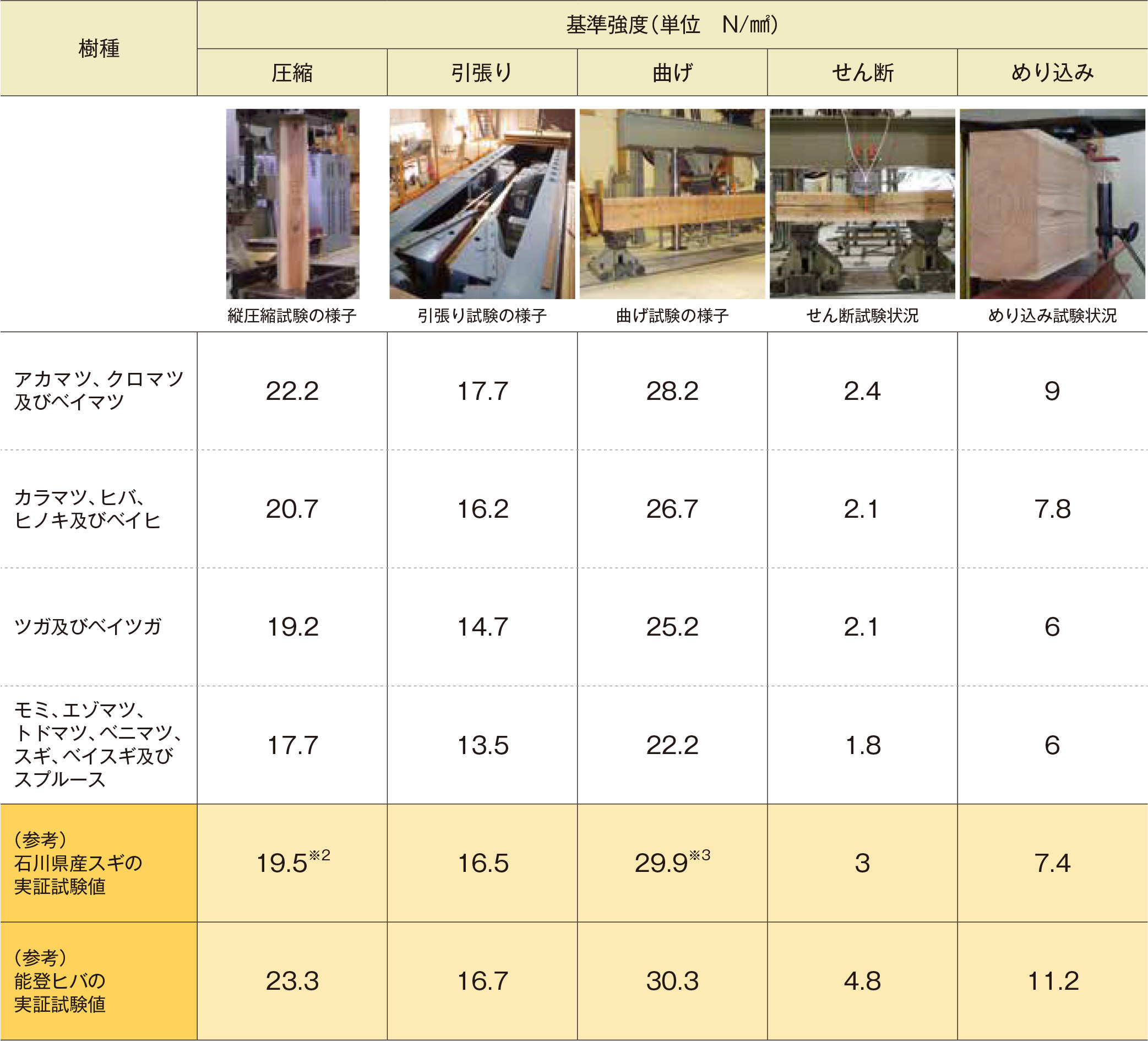 ※2 石川県産スギの実証試験値の圧縮強度については、正角材のみのデータです。