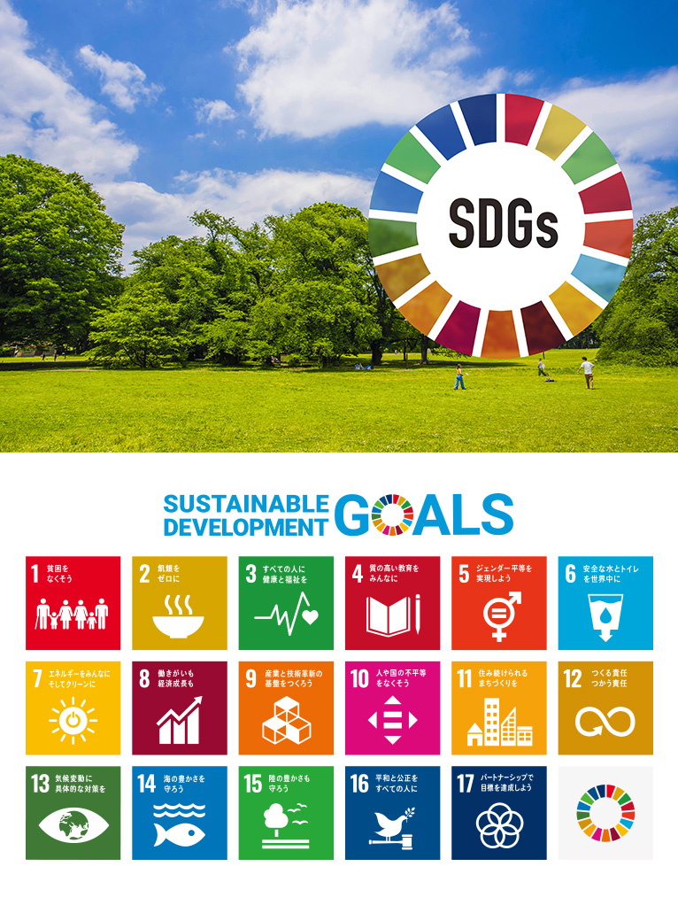SDGs(Sustainable Development Goals=持続可能な開発目標)とは、世界が抱える問題を解決し、持続可能な社会をつくるために世界各国が合意した17の目標と169のターゲットです。気候変動、エネルギー、環境保全、教育など、2030年までに達成すべきビジョンや課題が示されています。